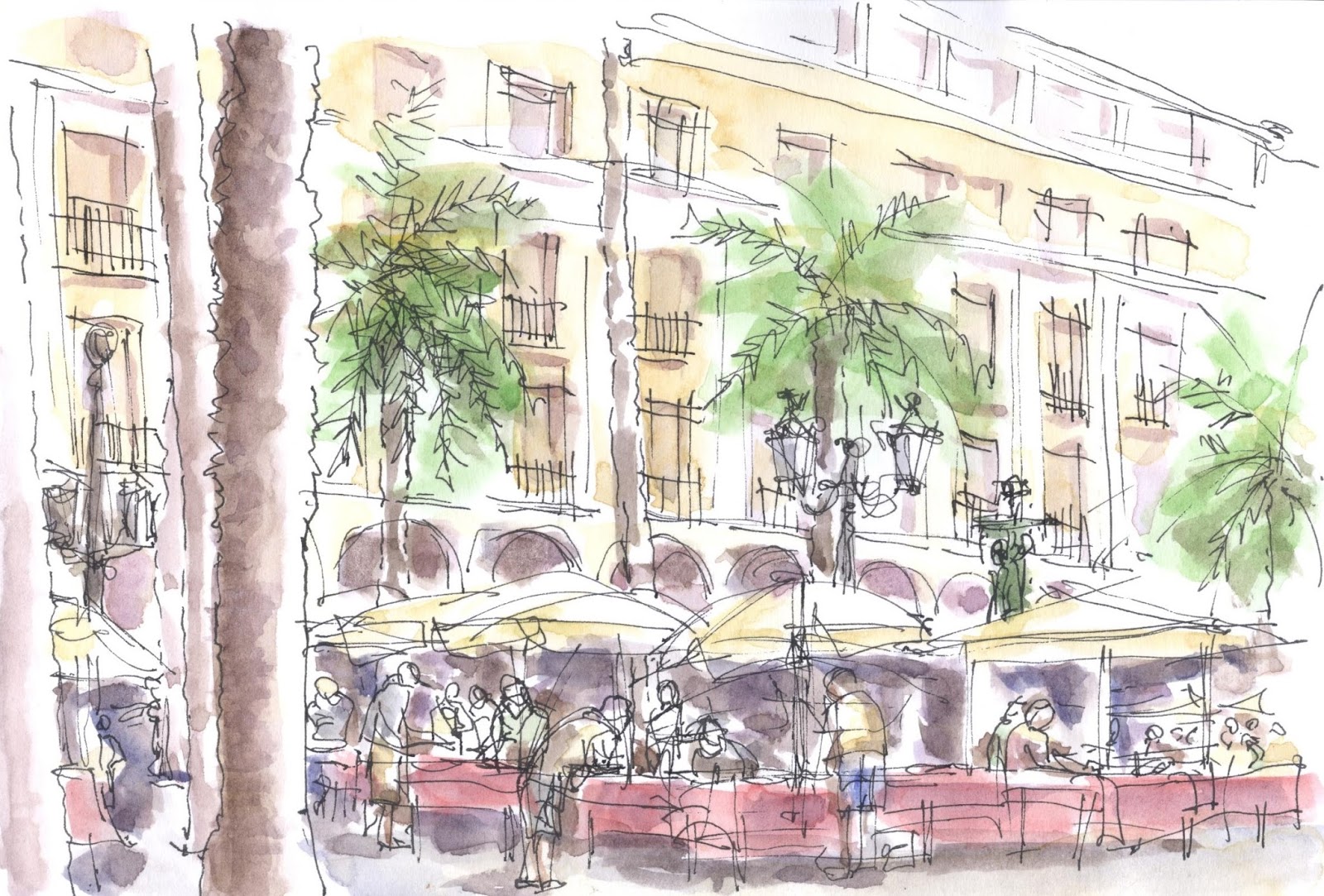 A Rambla, ou como costumamos dizer "as Ramblas", é um local de passagem de milhares de pessoas, é mesmo estonteante! As únicas pessoas paradas éramos nós e os vendedores das bancas, e claro que foram eles os alvos das minhas tentativas de desenhos.