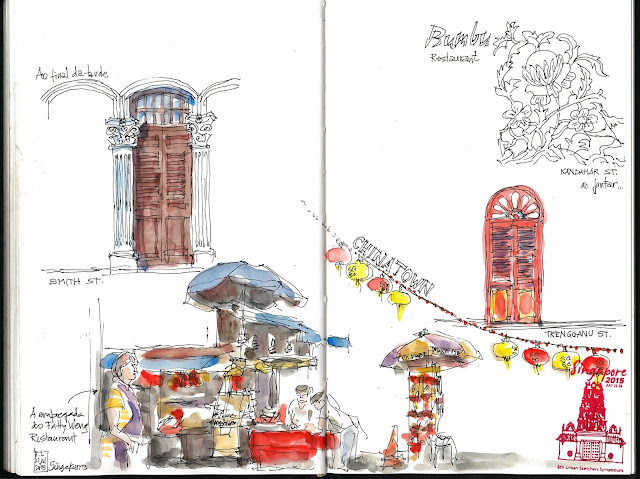 Em Chinatown, ao fim da tarde, a mistura da arquitectura com as cores predominantes aqui, vermelho e amarelo, e sempre gente, muita gente. Locais, turistas, a passar num corropio. Tempo para desenhar e beber uma Coca Cola para repor energias, com o Luís e a Birgit.