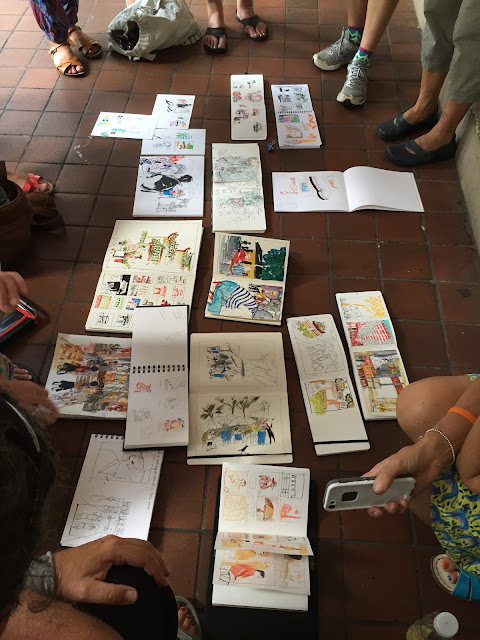 Confesso que já estava um pouco cansada de mudar de agulha. Interessante a abordagem, mas muito pouco tempo para desenhar. Ficou-me a forma que ela utiliza para entender o que vê. Como cria narrativas com desenhos e textos, como deixa os desenhos respirar nas páginas. Como cria uma sequência de elementos, um fio condutor, uma história. Há sempre uma história nos seus desenhos.