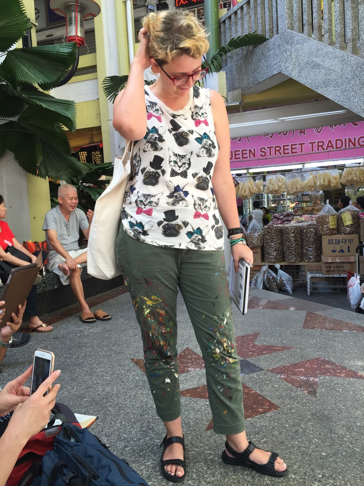 Giras as calças desta minha colega, todas pintadas de tinta...