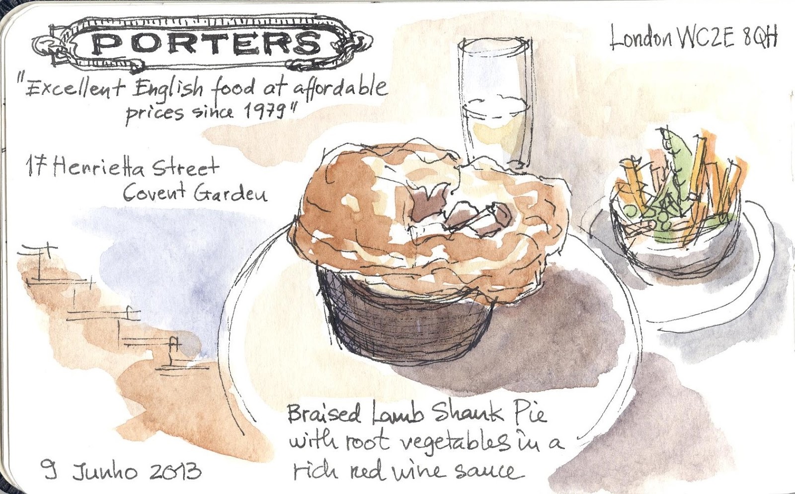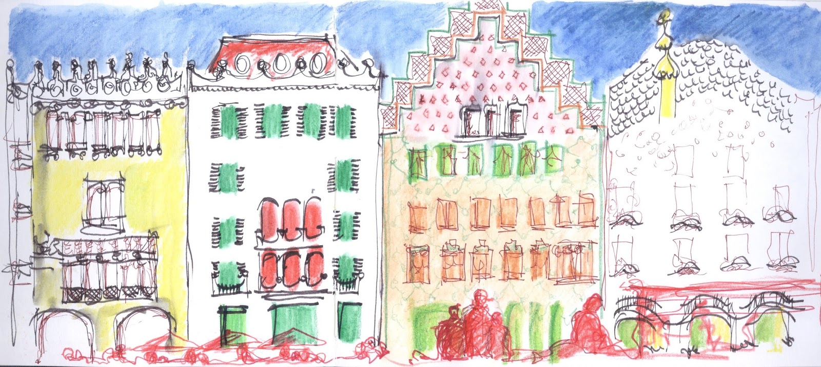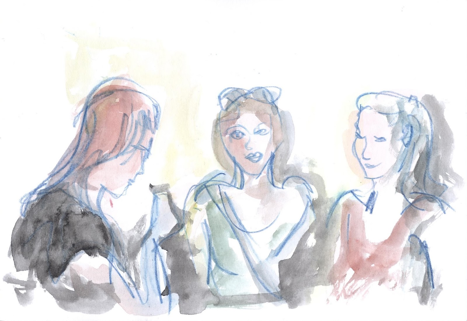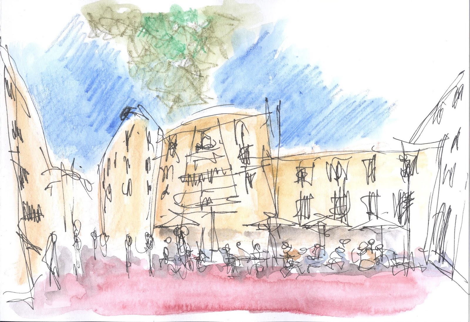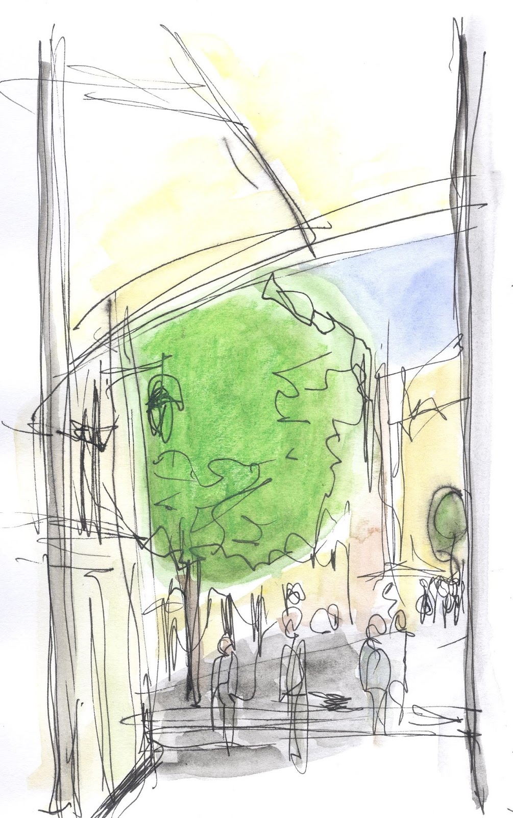 Terceiro exercício: Tentar novas técnicas. Começar com grandes manchas de aguarela, depois lápis aguarelável, e aguarela outra vez.