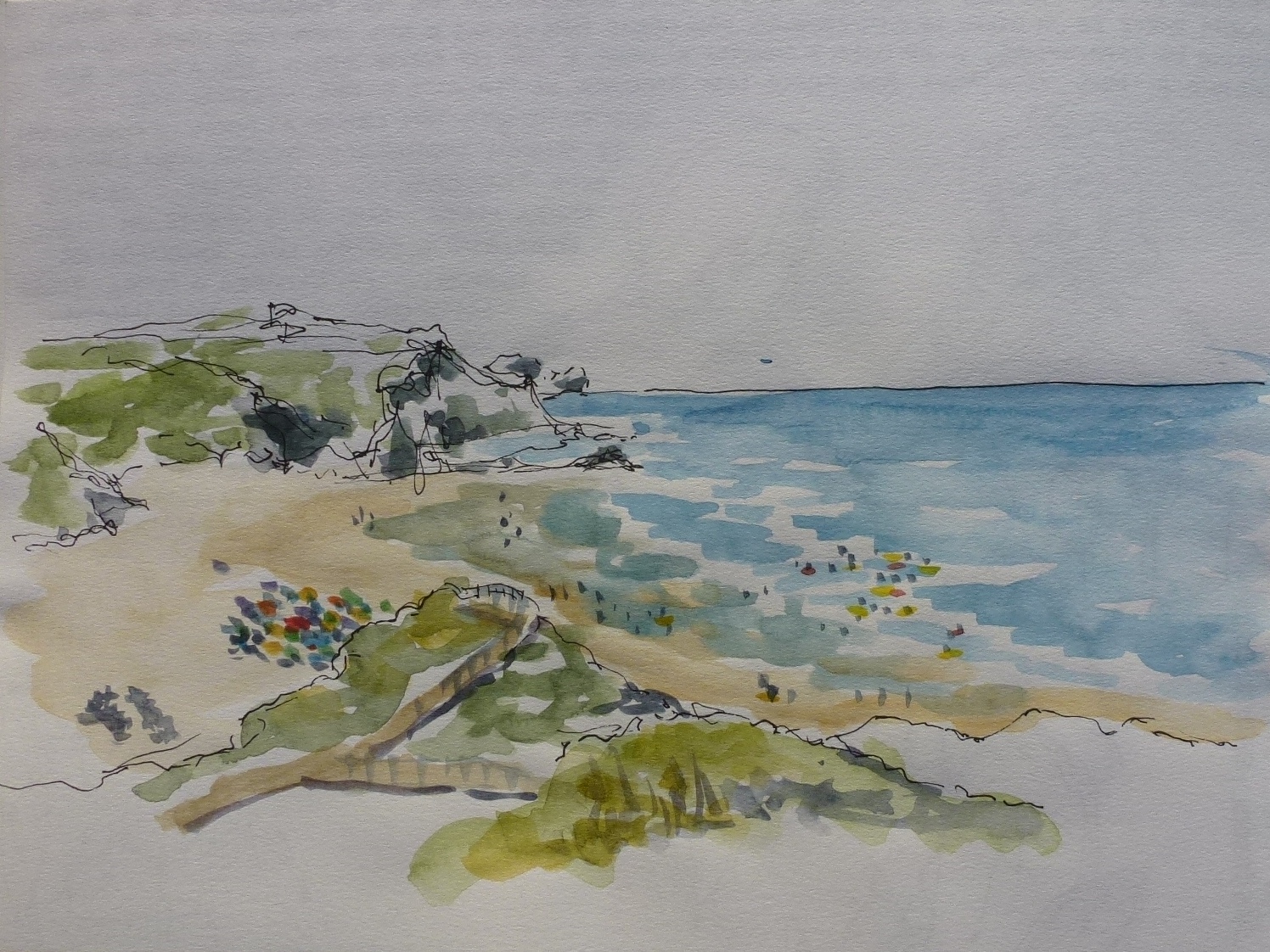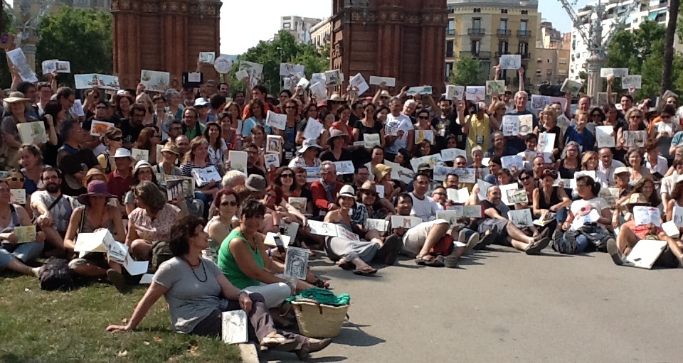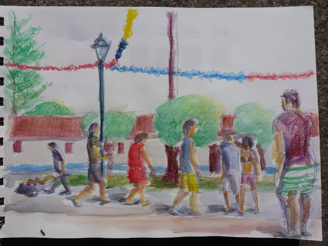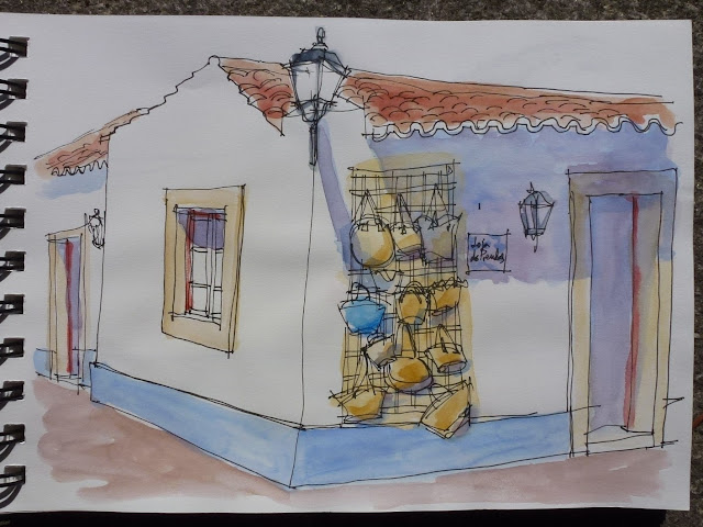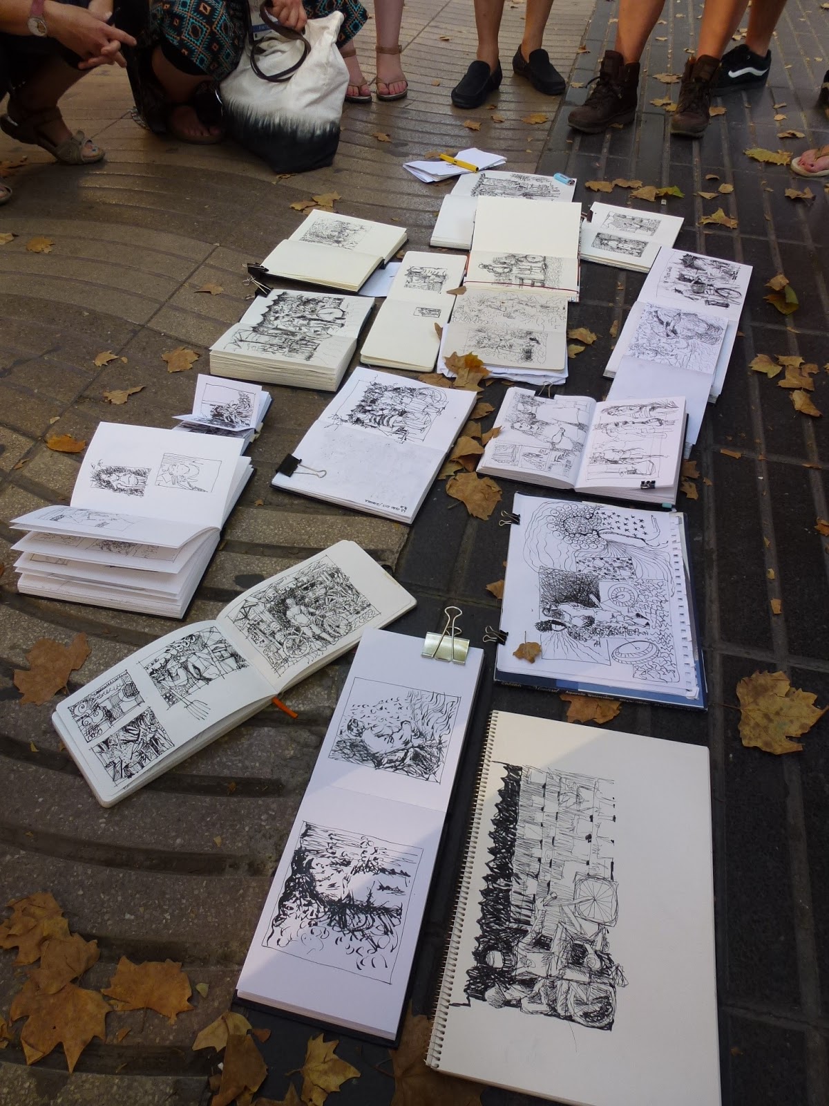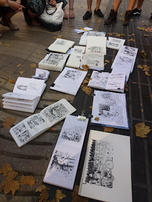 A Rambla, ou como costumamos dizer "as Ramblas", é um local de passagem de milhares de pessoas, é mesmo estonteante! As únicas pessoas paradas éramos nós e os vendedores das bancas, e claro que foram eles os alvos das minhas tentativas de desenhos.