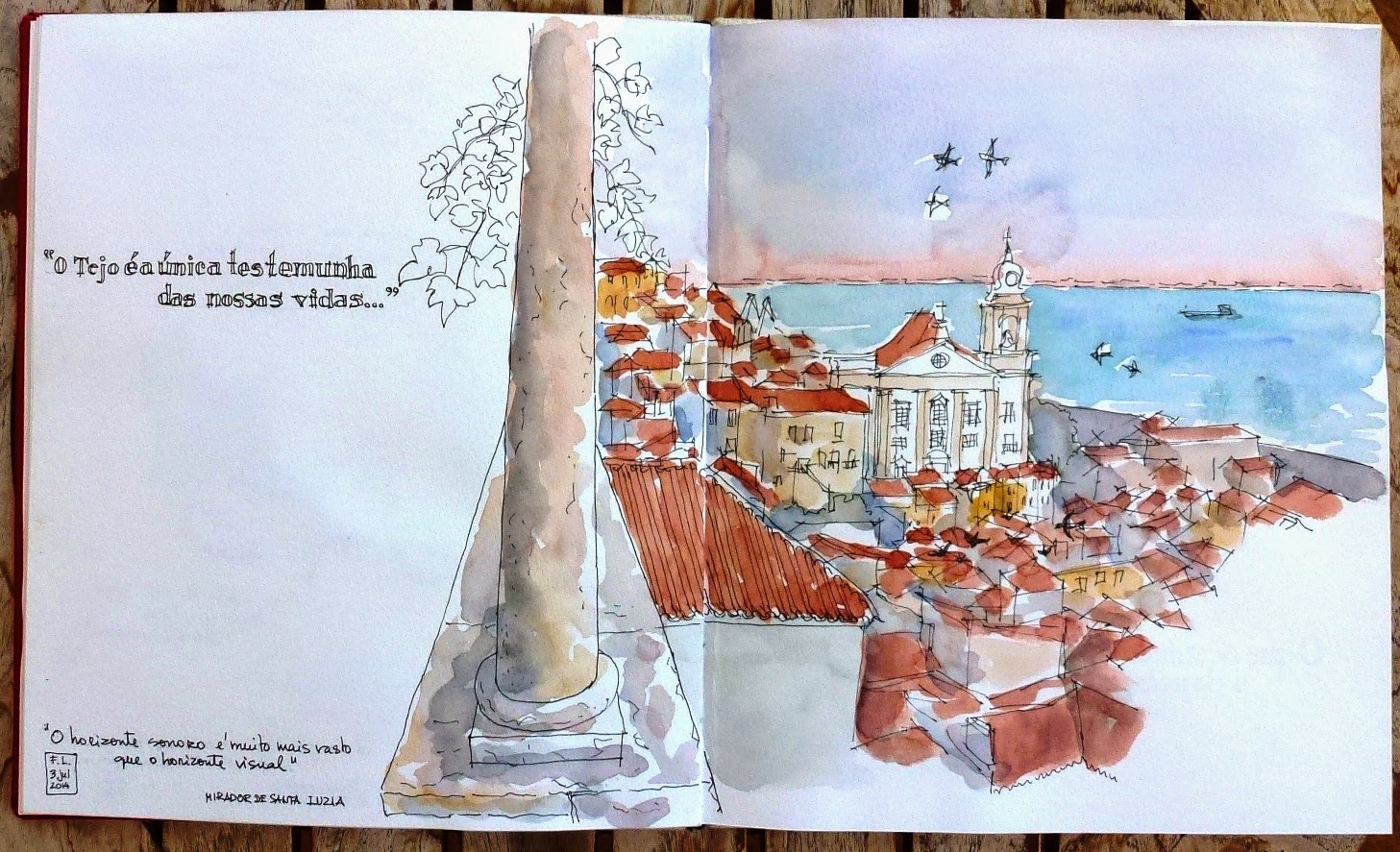 Escolhi este, dos quatro desenhos que fiz ao longo destes dias. Uma vista desde o mirador de Santa Luzia, com o Tejo ao fundo. Ainda recordo os sons que me envolviam: Os carros ao fundo na marginal junto ao rio, o chilrear dos pássaros, os eléctricos a passar, as vozes das pessoas a conversar atràs da coluna de pedra, vários grupos de turistas que chegavam e que partiam (ia adivinhando de que país eram), os sinos das igrejas que me situavam na hora, enfim, toda esta amálgama de constitui o ruído da cidade.