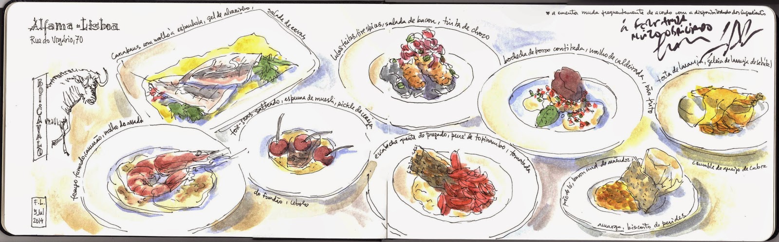 Em plena Alfama, um restaurante que vale a pena conhecer: Boi-Cavalo! A refeição é feita à base de pequenos pratos muito saborosos e originais, decoração (era um antigo talho) e ambiente descontraídos. Começou a ser um hábito ter os meus desenhos assinados pelo Chef, que neste caso são dois, o Hugo Brito e o Pedro Duarte.